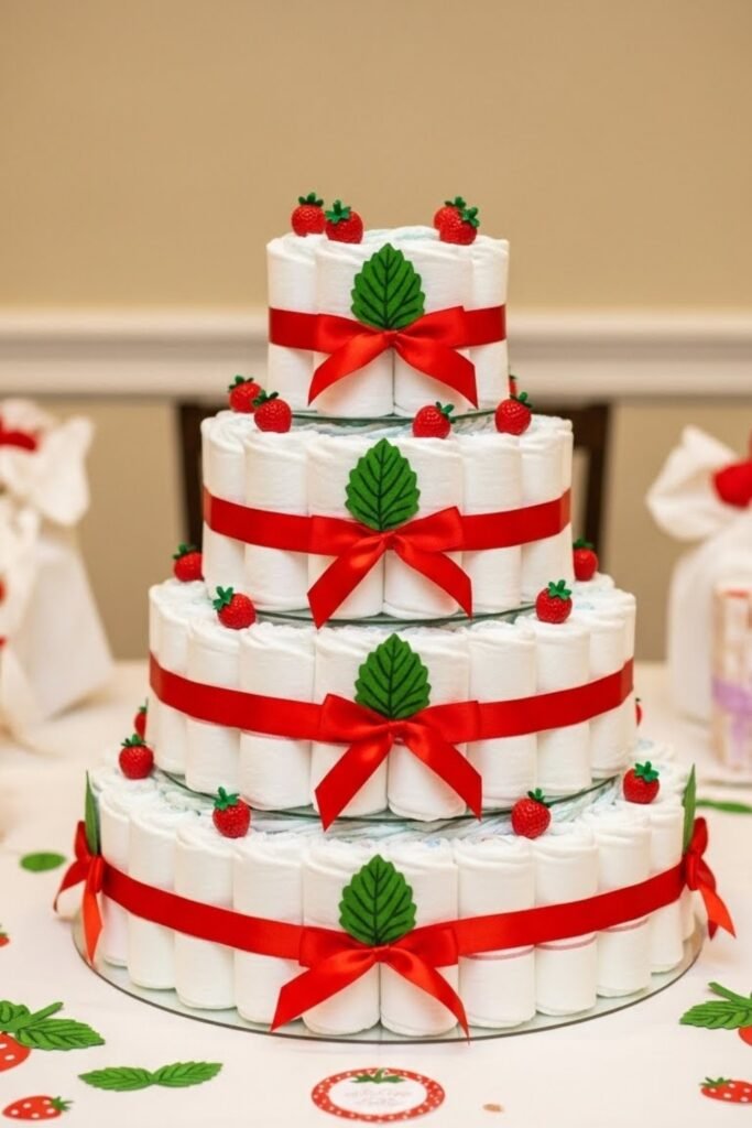 Turn diapers into a strawberry-themed centerpiece by stacking them in tiers. Wrap each layer with red ribbon and add green leaf accents to mimic a berry look.