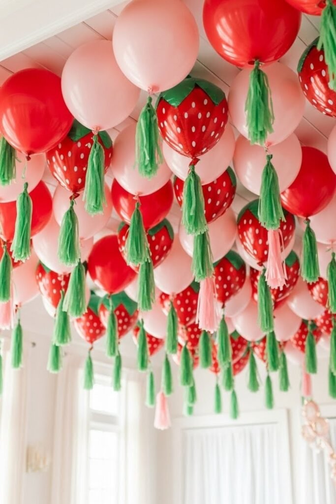 Hang red and pink balloons from the ceiling at different heights. Add small green tassels to suggest strawberries without being literal.