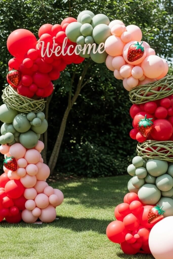 Create a strawberry-themed entrance using red, blush, and soft green balloons. Add subtle strawberry accents or leaf details so the arch feels playful, not heavy.