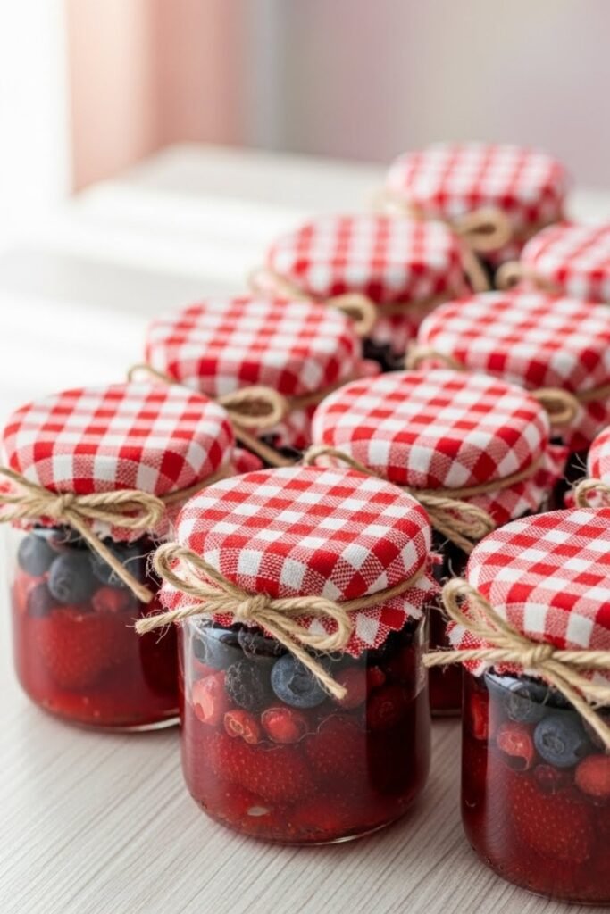 Fill small jars with strawberry jam, honey, or freeze-dried berries. Tie each jar with gingham fabric or twine for a simple finish.