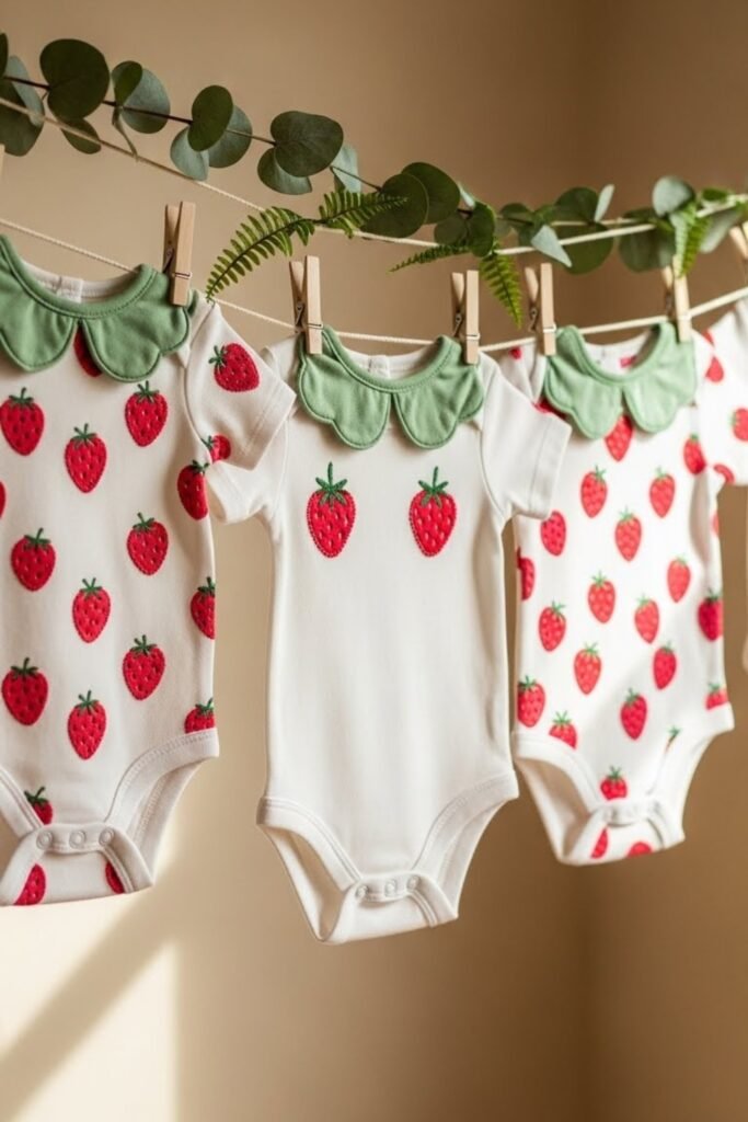 Hang strawberry-themed baby onesies on a small clothesline using wooden pins.