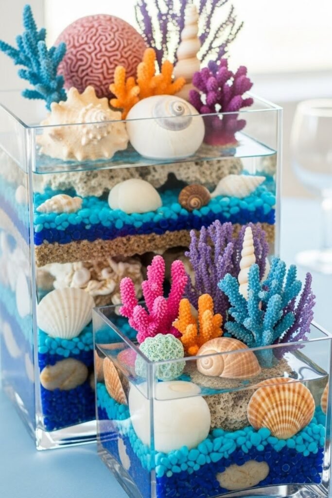 Design small reef-style displays using layered textures like faux coral, shells, and blue-toned stones. Arrange them in clear containers or shallow trays as table décor.