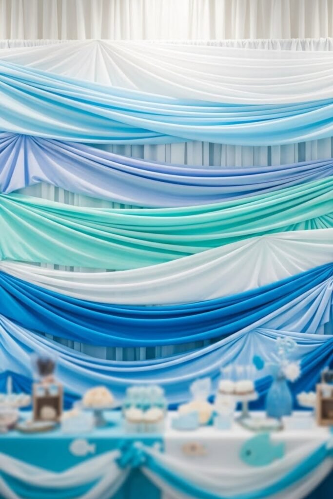 Set up a backdrop that mimics gentle ocean waves using layered fabric, paper panels, or curved cutouts. Use varying shades of blue and white to create movement.