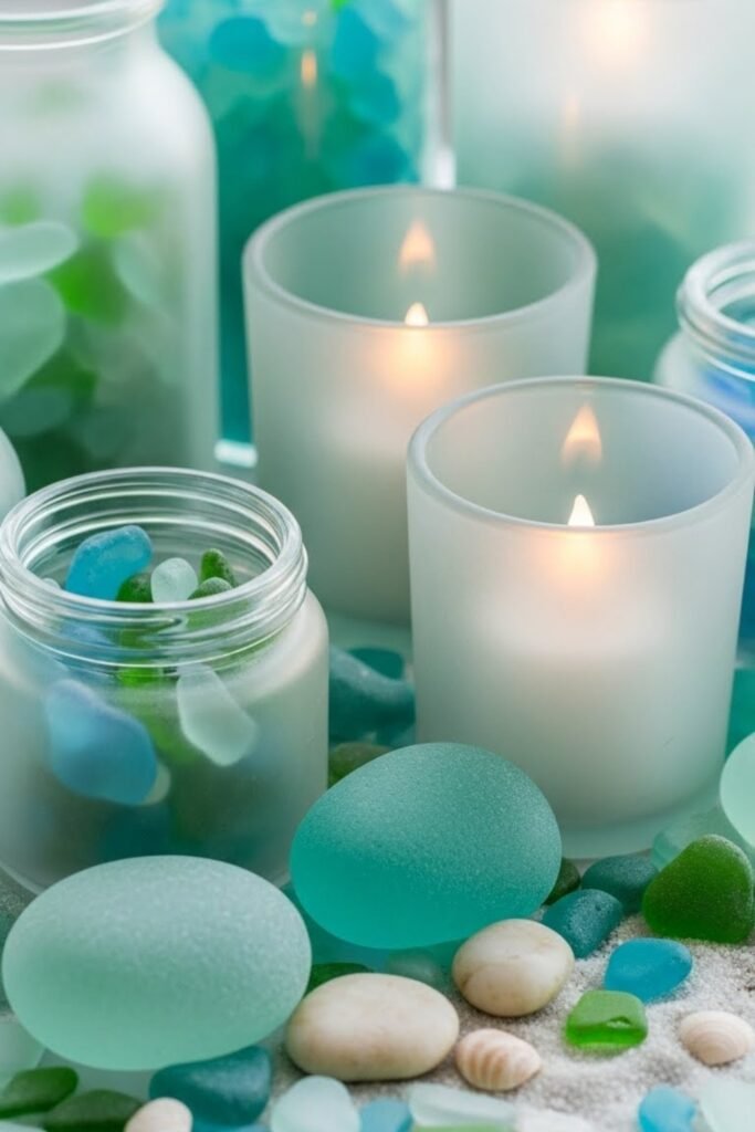 Incorporate sea-glass colors through jars, candle holders, or decorative bottles. Soft blues, greens, and frosted finishes reflect light beautifully and add a calm coastal touch.
