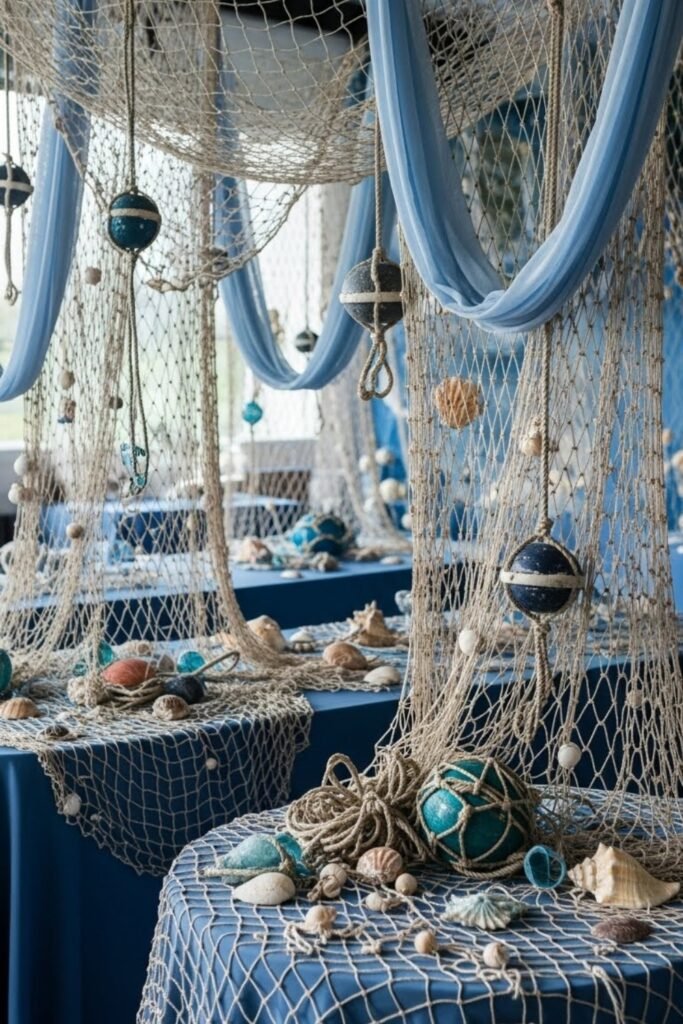 Use lightweight fishing nets draped loosely along walls, tables, or backdrops to add subtle ocean texture. Tuck in soft blue fabric, faux shells, or small decorative floats for depth.