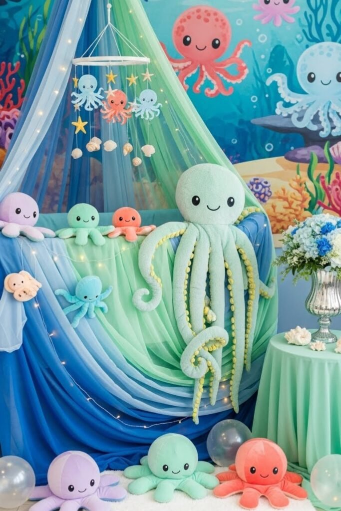 Designate a small themed corner featuring octopus-inspired décor. Use plush octopus figures, curled paper cutouts, or illustrated prints to add playful charm.