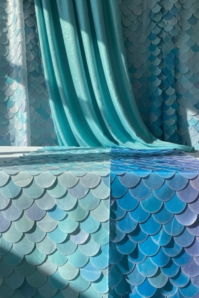 Introduce scale patterns through tablecloths, runners, or backdrop panels. Shimmery fabrics or printed textures in blues and soft purples work best.