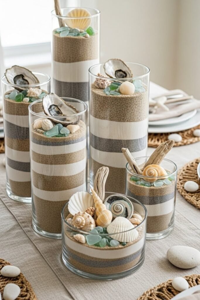 Create a soft, beach-inspired display using neutral sand tones as the base. Fill clear containers with sand, shells, or layered textures and place them on a side table or dessert station.