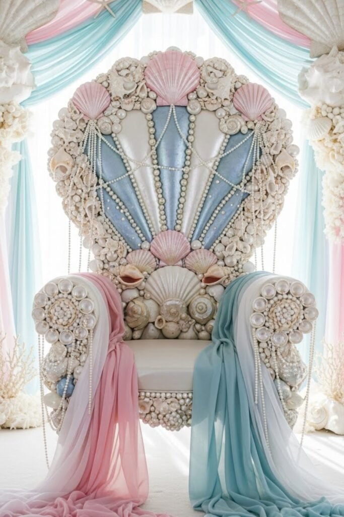 Design a special seating area for the guest of honor using shell-shaped décor or a shell-inspired backdrop. Layer soft fabrics, pearls, and ocean colors to make it feel elevated yet cozy.