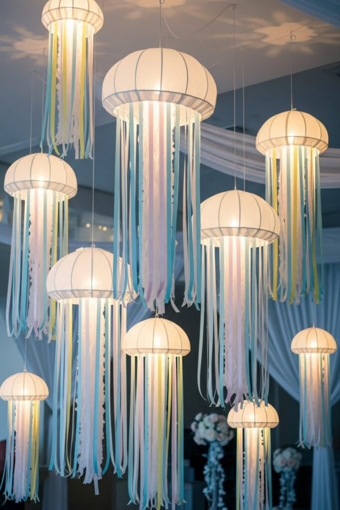 Hang jellyfish-style lanterns from the ceiling using paper lanterns and flowing ribbon or sheer fabric strips. Soft pastel colors or translucent whites work best.