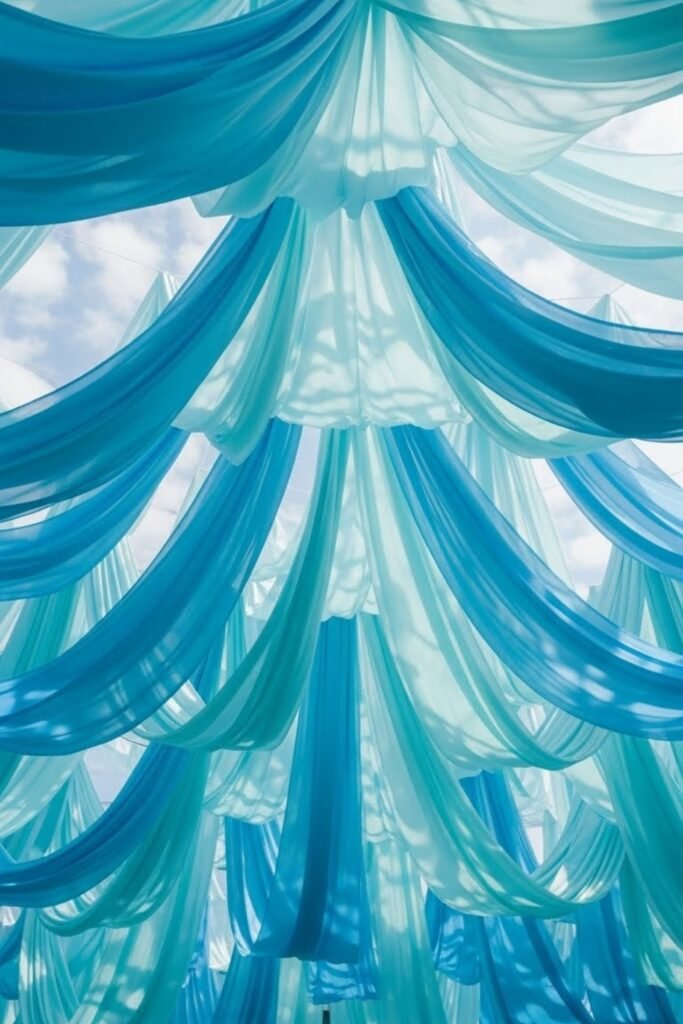 Create a flowing canopy overhead using sheer blue and aqua fabrics. Drape the material loosely to mimic the movement of water above the ocean floor.