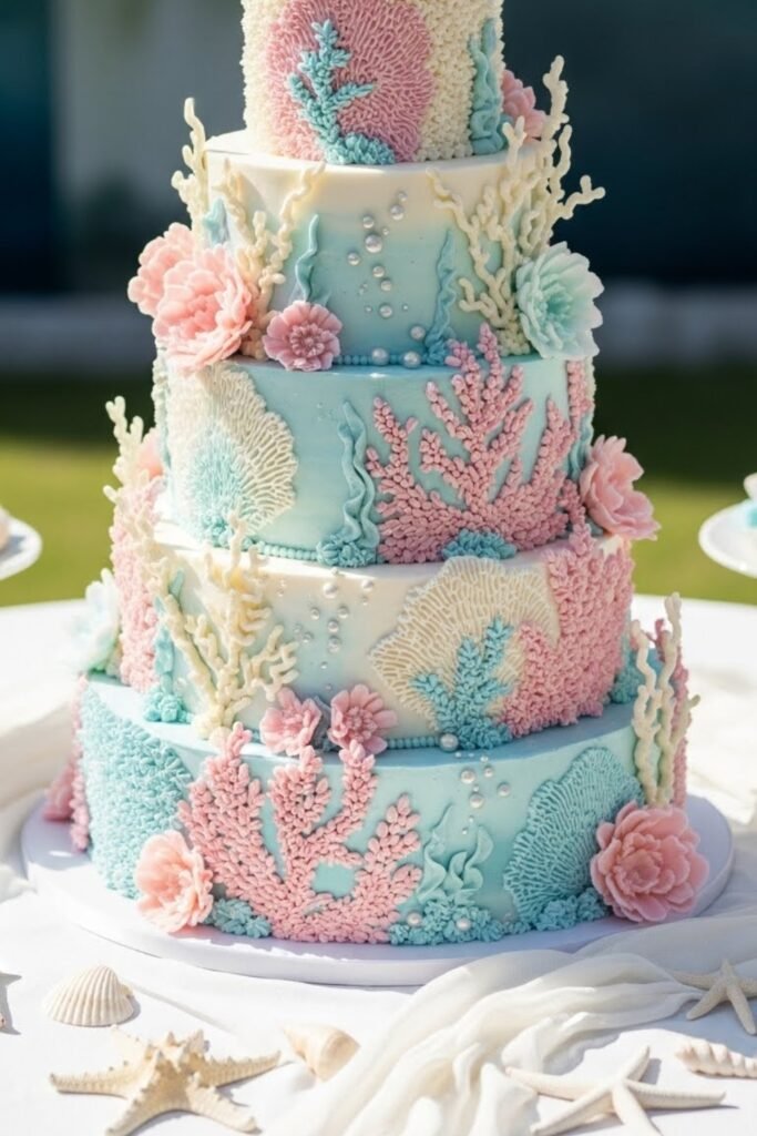 A coral cake becomes a strong centerpiece that ties the underwater concept together without overpowering the dessert table.