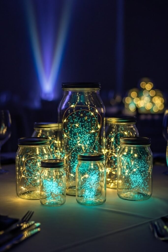 Add a soft glow effect using warm fairy lights, LED candles, or subtle luminescent accents placed inside jars or behind sheer fabric.