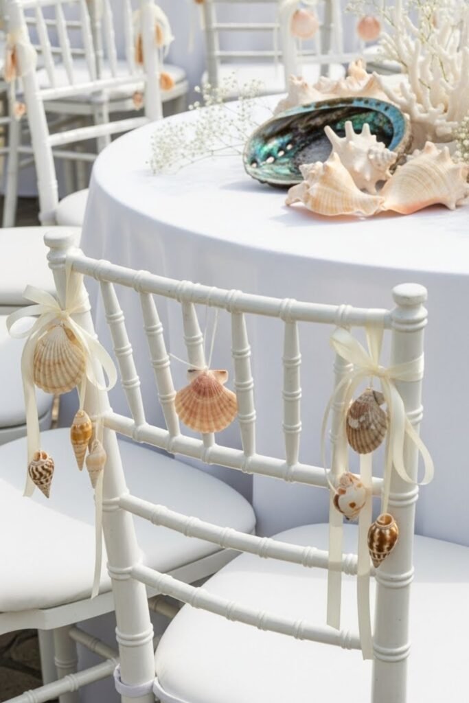 Style guest seating with subtle seashell details. Tie small shell charms to chair backs using twine or satin ribbon, or place a single decorative shell on each seat.