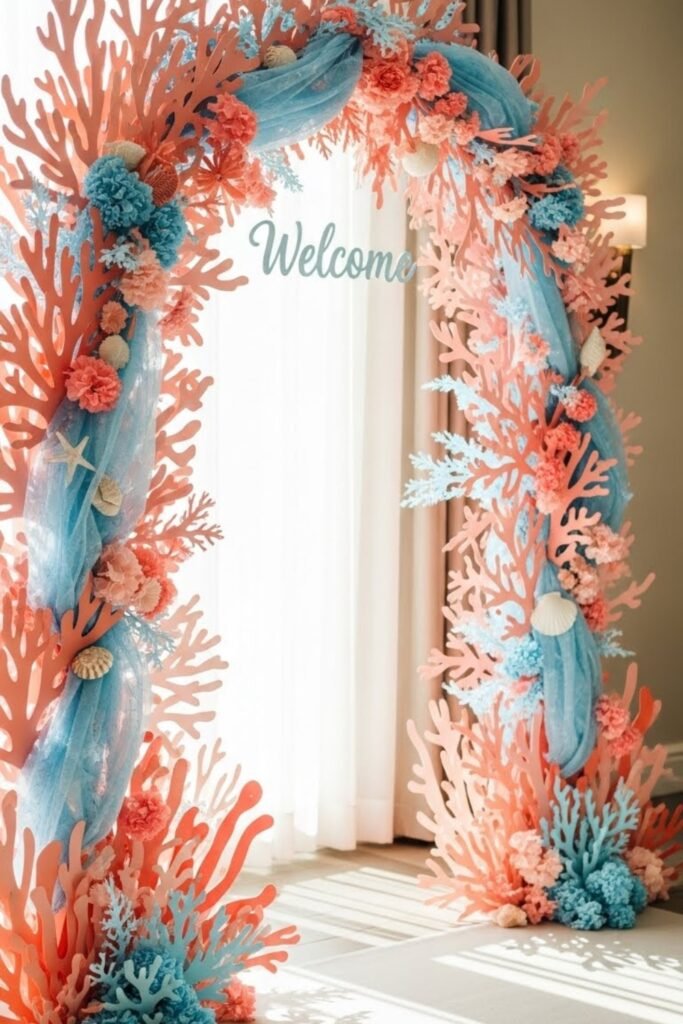 Create a first impression using coral-inspired décor at the entrance. Use coral-shaped cutouts, soft pinks, peaches, and seafoam tones layered with ocean blues.