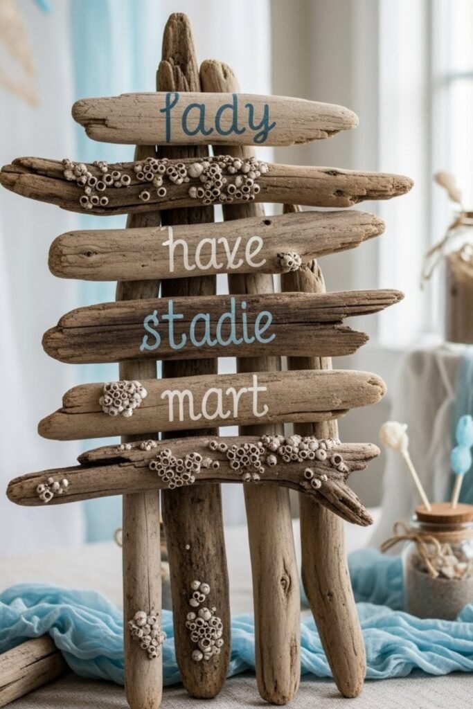Use faux or real driftwood to create directional or decorative signs. Write short phrases like “Welcome,” “Gifts,” or “Treats” using paint or vinyl lettering.