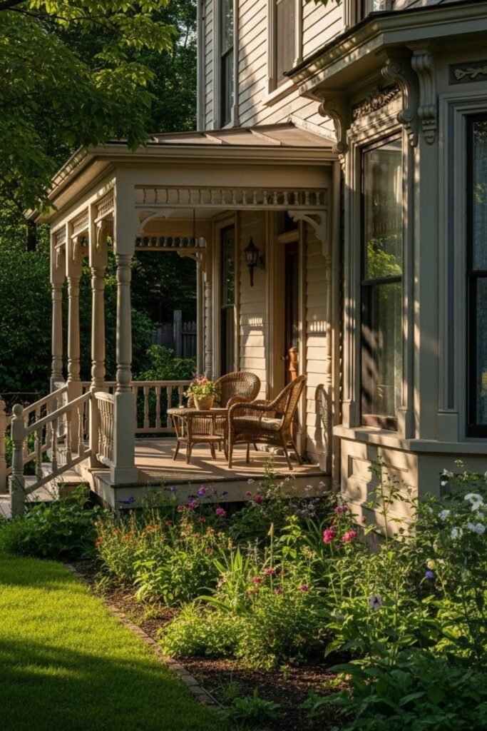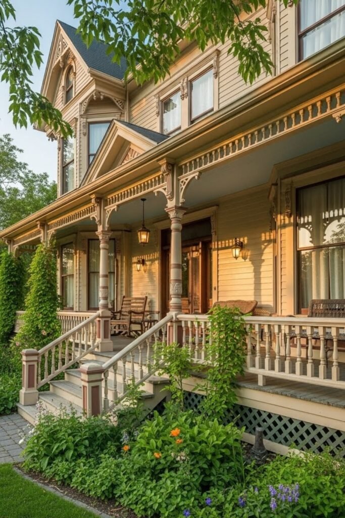 A wraparound porch is one of the most recognizable Victorian features. It extends around the front and side of the house, offering shaded outdoor living and multiple seating areas.