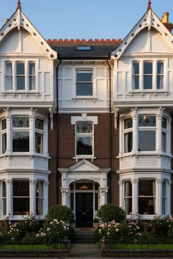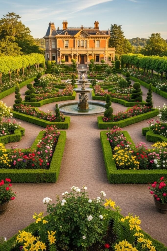 Formal gardens complement Victorian homes with structured beauty. Symmetrical pathways, trimmed hedges, and decorative flower beds create a polished outdoor setting.