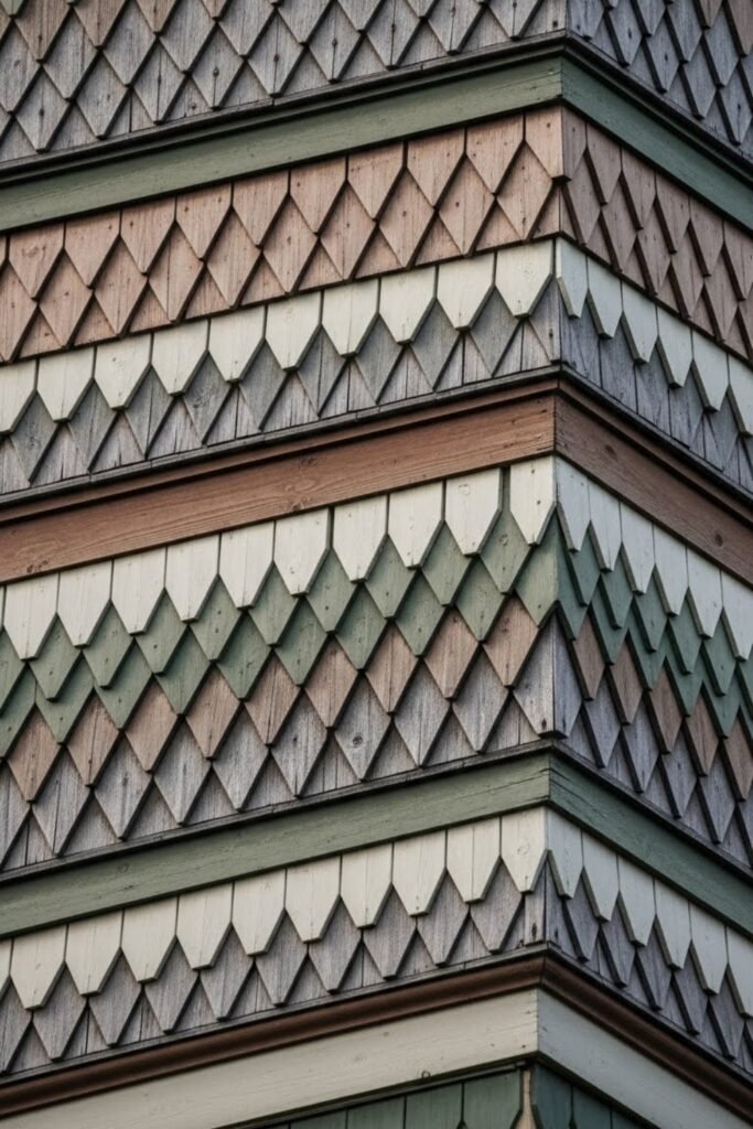 Patterned shingles add texture and visual interest to Victorian exteriors. Often arranged in fish-scale, diamond, or staggered designs, they break up large wall areas.