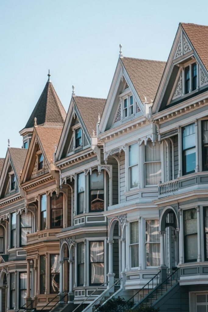 Painted Ladies style uses multiple coordinated colors to highlight architectural details. Contrasting hues emphasize trim, gables, and window frames, bringing out Victorian ornamentation. This approach adds personality without altering structure.