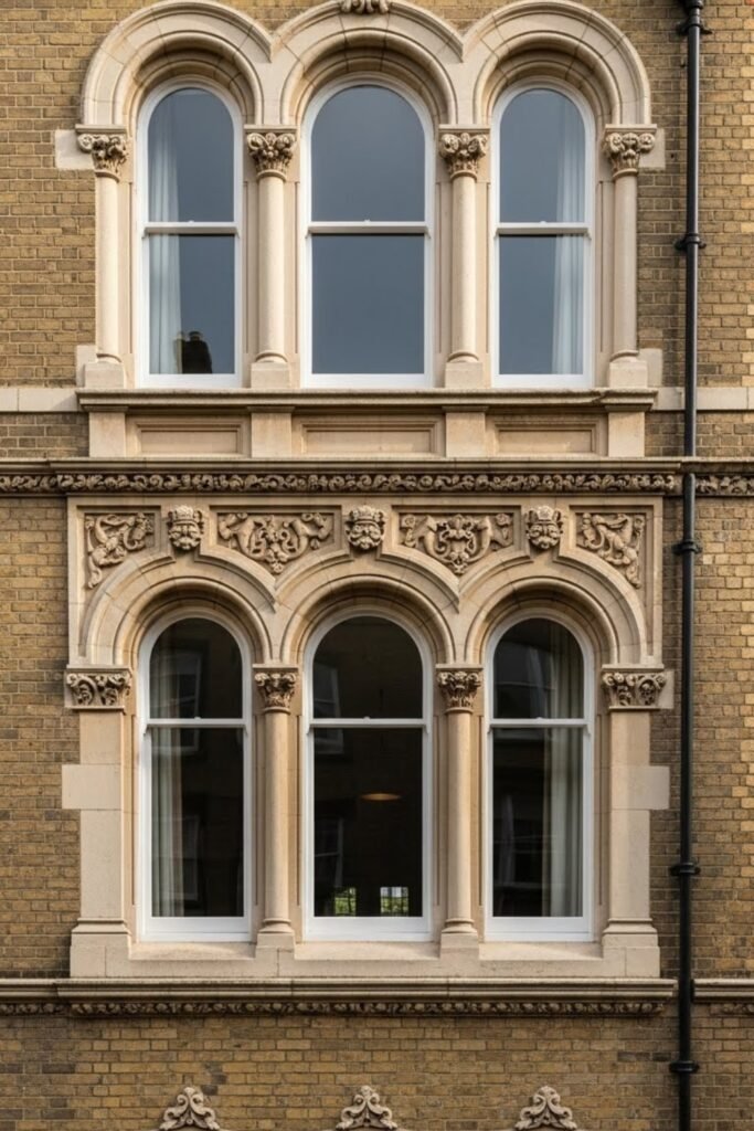 Arched windows soften the strong lines of Victorian architecture. Their curved shape adds elegance and draws attention to key areas of the facade.