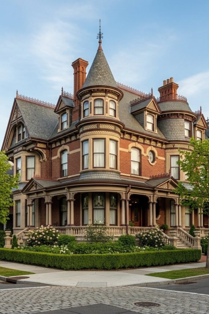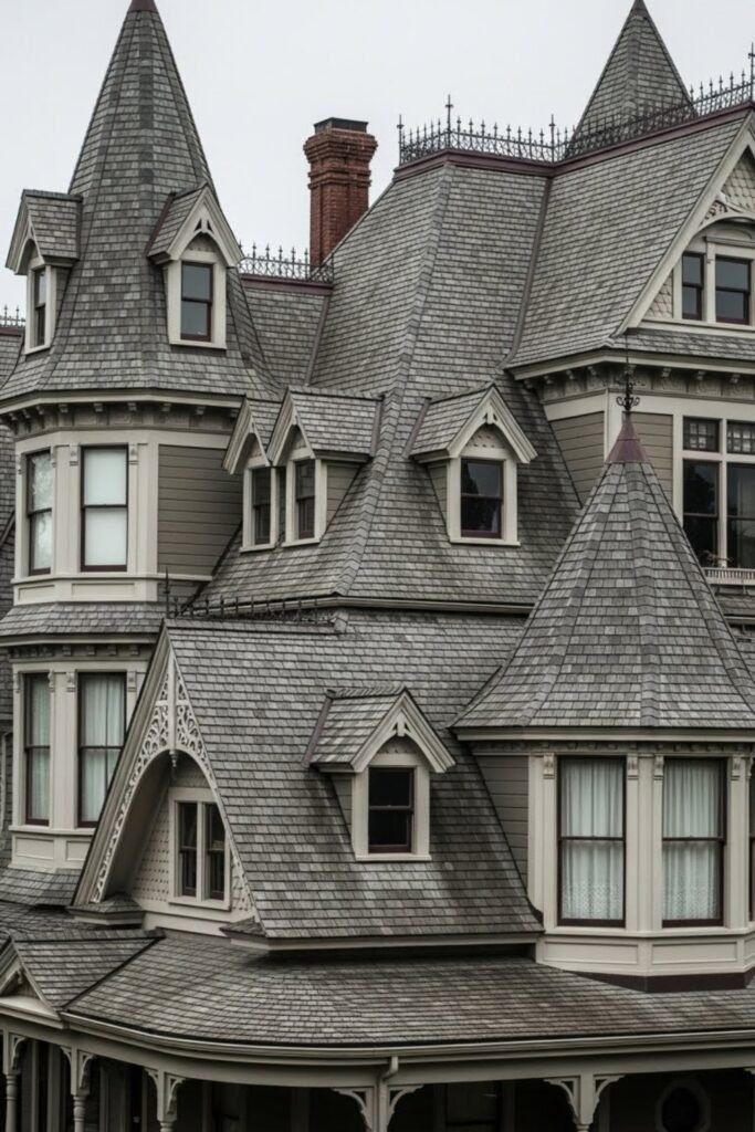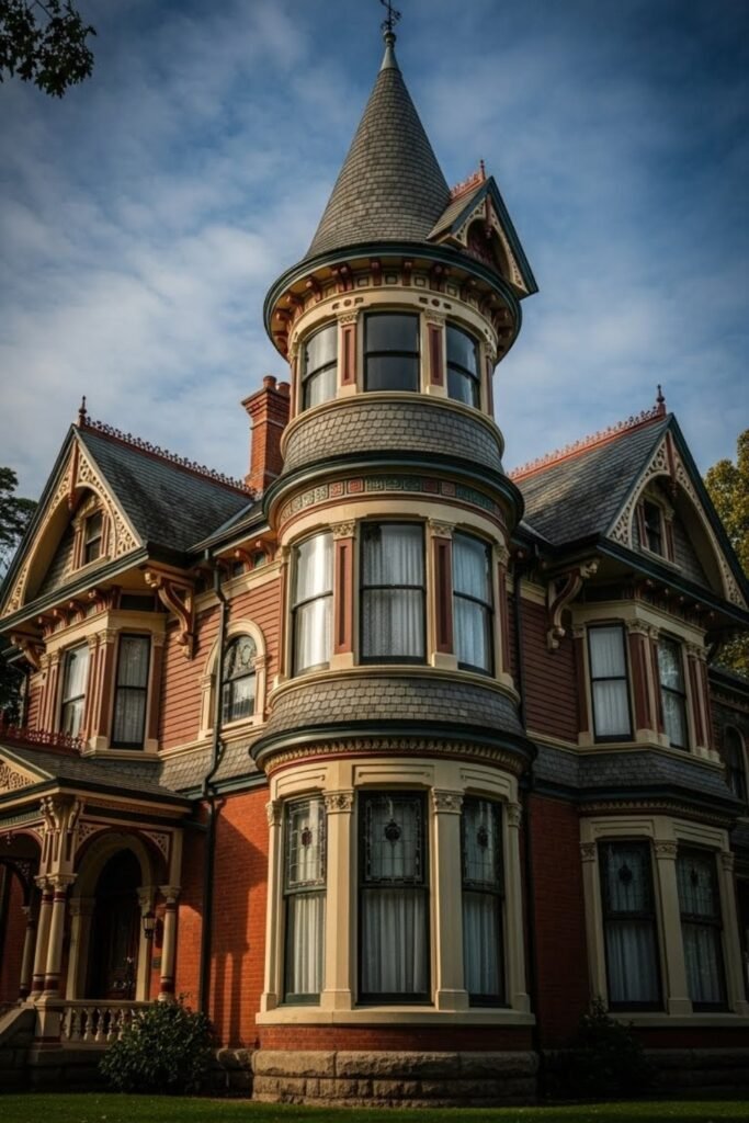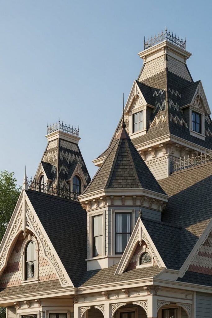 They also pair well with dormers and gables. This design suits areas with heavy rain or snow while reinforcing the vertical, elegant style typical of Victorian homes.