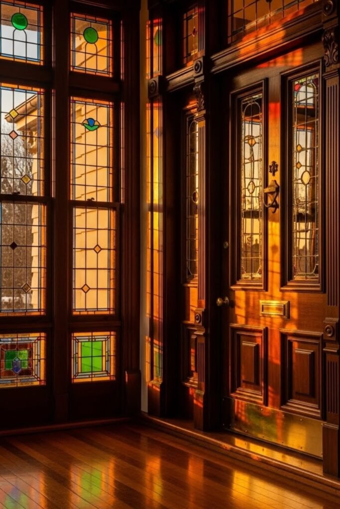 Stained glass windows add color, privacy, and artistic beauty to Victorian homes. Often placed near entryways, staircases, or transoms, they create a soft glow when sunlight passes through.