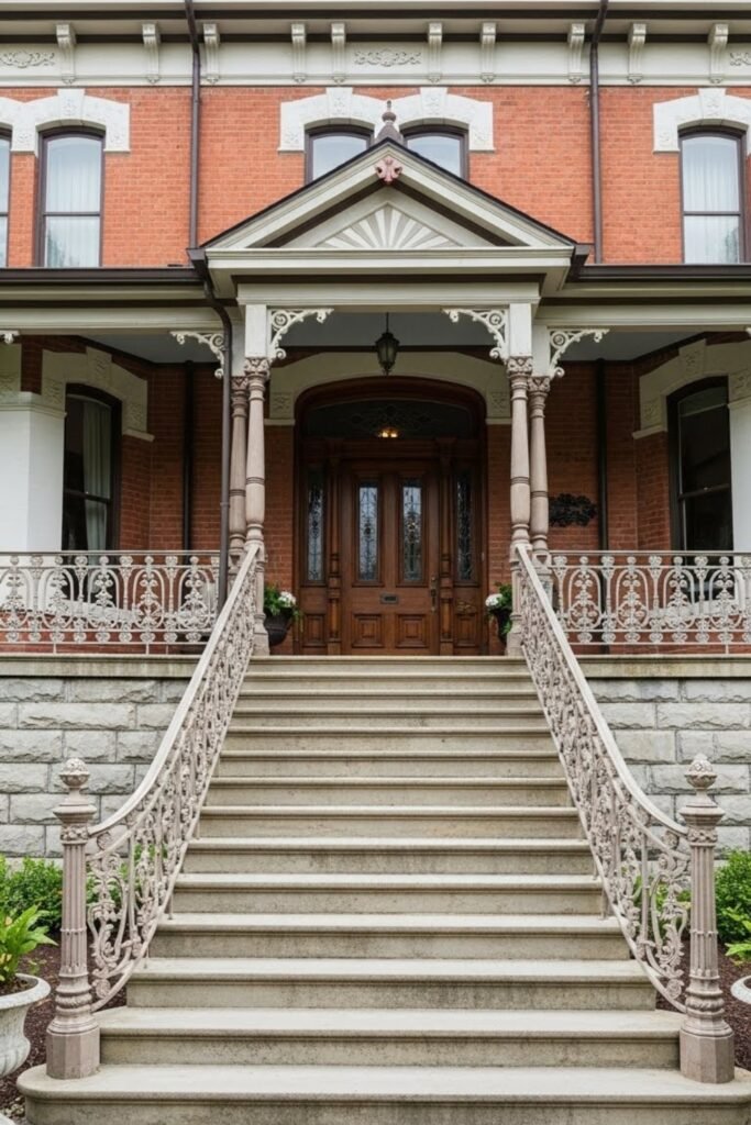 Grand front steps create a strong first impression for a Victorian home. Wide staircases, often made of stone or wood, elevate the entrance and emphasize formality.