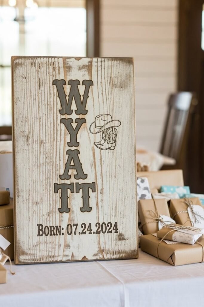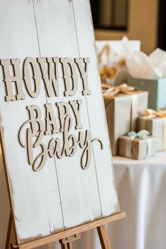 Use a clean “Howdy Baby” sign in a western-style font on wood or canvas. Keep the colors soft—cream, tan, or light brown—for a modern rustic feel.