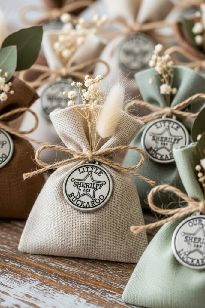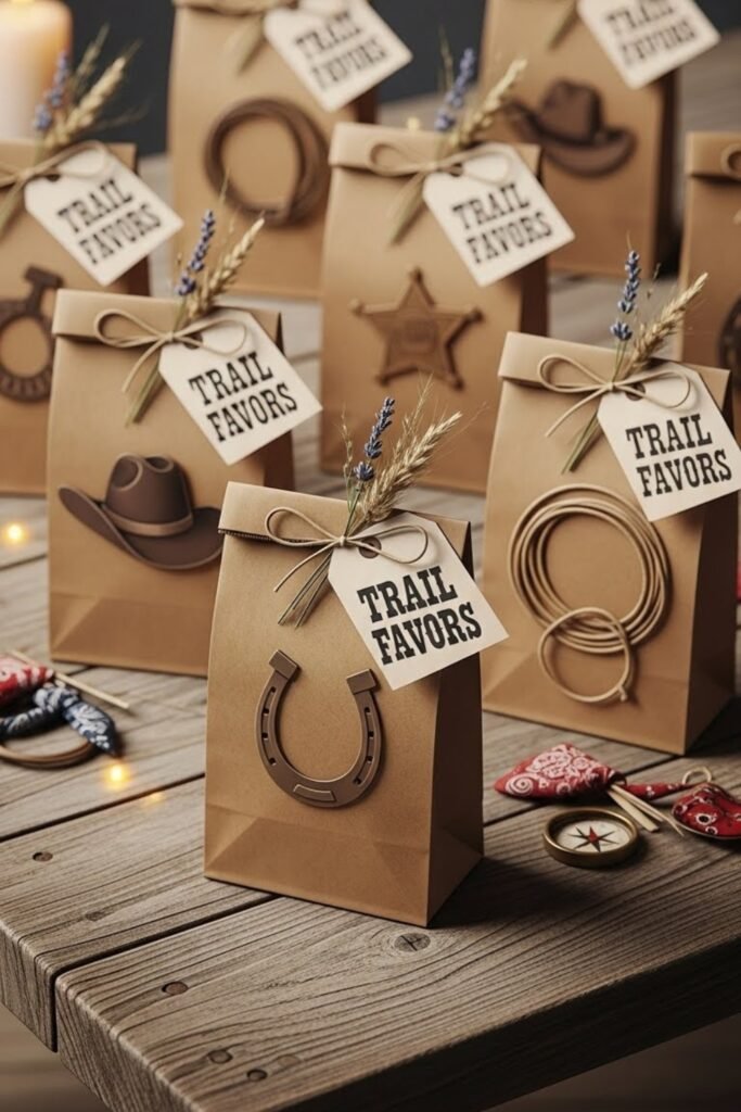 Use kraft paper favor bags styled like western trail packs. Stamp or sticker them with boots, stars, or horseshoes for a subtle theme.