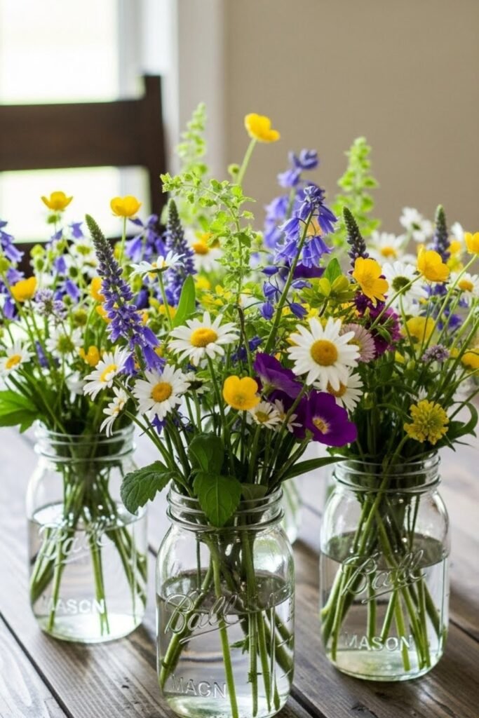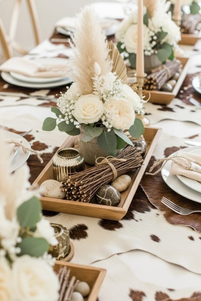 Use clear or lightly frosted mason jars filled with wildflowers or dried stems. Keep arrangements loose and natural to match the western vibe.