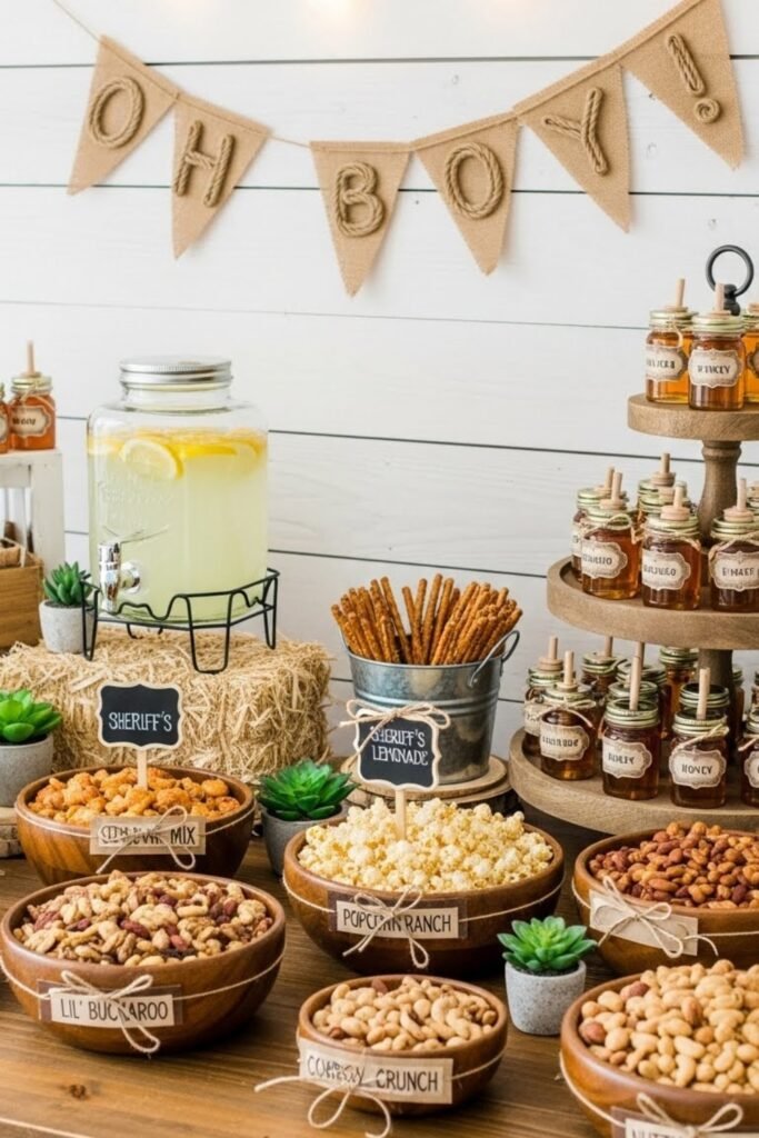 Create a western-style snack bar with trail mix, popcorn, nuts, and simple sweets. Use wooden bowls, metal trays, or paper cones for serving.