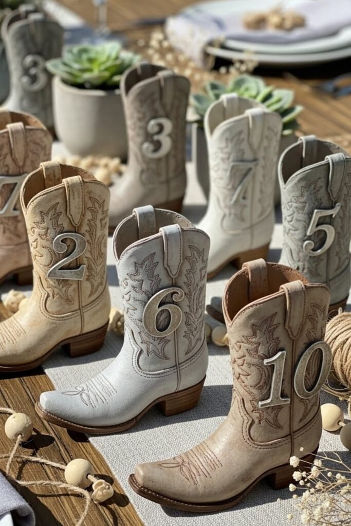 Design table numbers shaped like cowboy boots or printed with boot illustrations. Keep the colors muted so they blend with the rest of the décor.