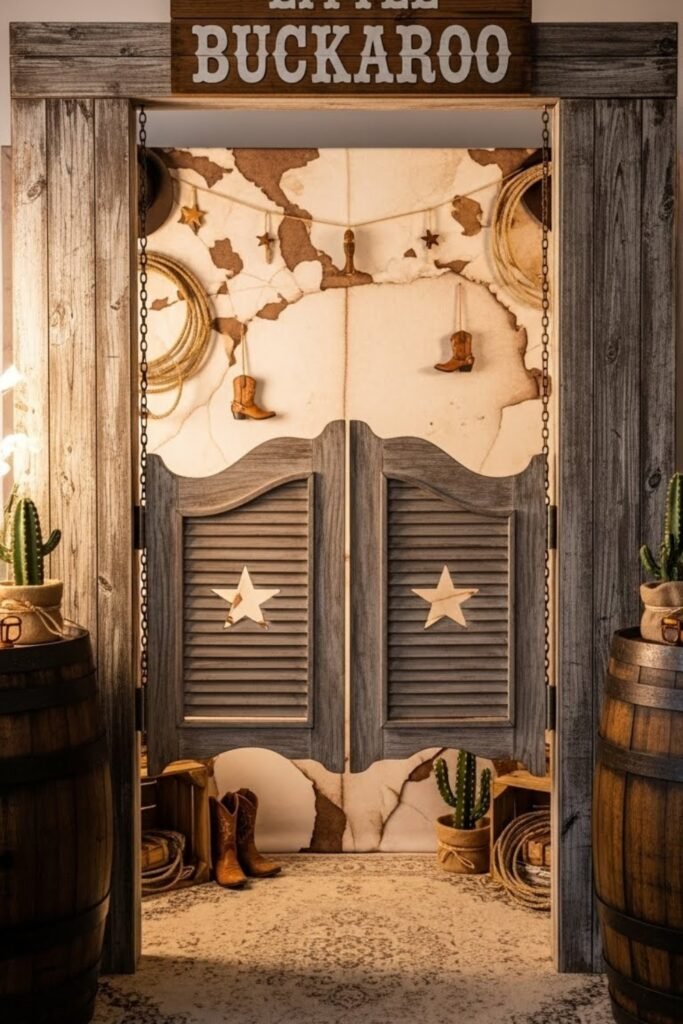 Style the entrance like a simple ranch gate using wood panels, rope, and neutral signage. Add hay accents or a small wooden wagon to hint at the western theme without overdoing it.