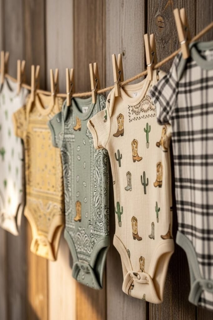 Hang baby onesies on a rope using wooden clothespins to create a western-style display. Choose neutral or soft western prints so it feels coordinated.