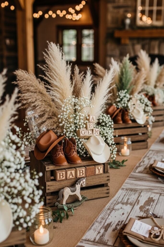 Place them on tables, food stations, or shelves. This idea adds softness and color without overpowering the décor, making it perfect for rustic or neutral western baby showers.
