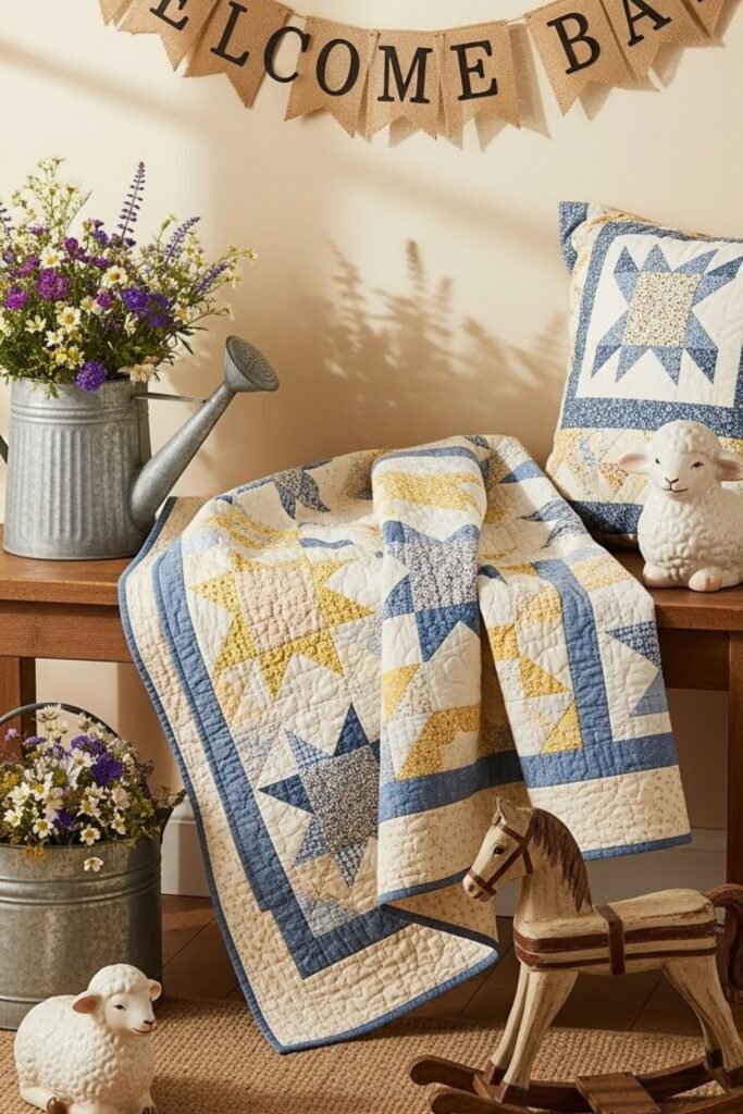 Create a cozy corner using a folded country-style quilt layered over a bench or chair. This area works well for gift placement or quiet seating.