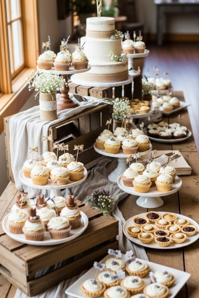 Create a dessert table using barnwood boards, wooden crates, or rustic trays layered at different heights. This setup adds western characters without themed treats.