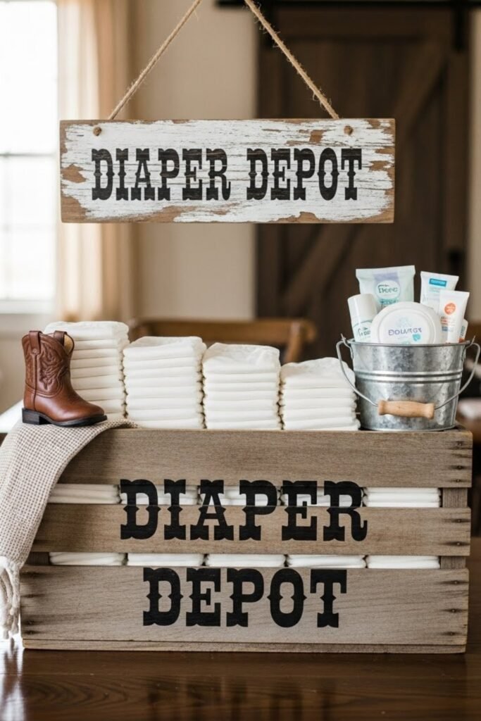 Set up a dedicated diaper station using a wooden crate labeled like a western supply post. Stack diapers neatly inside and add a small sign to guide guests.
