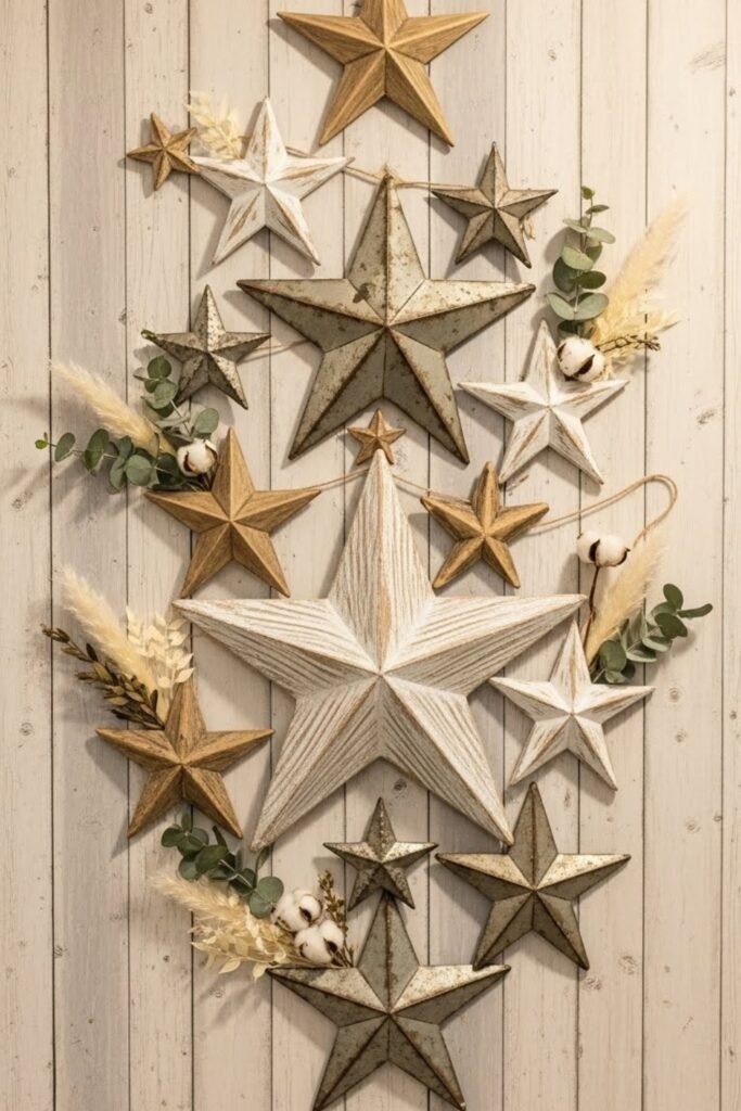 Decorate walls or shelves with metal or wooden barn stars in different sizes. Keep spacing loose so the wall doesn’t feel crowded.