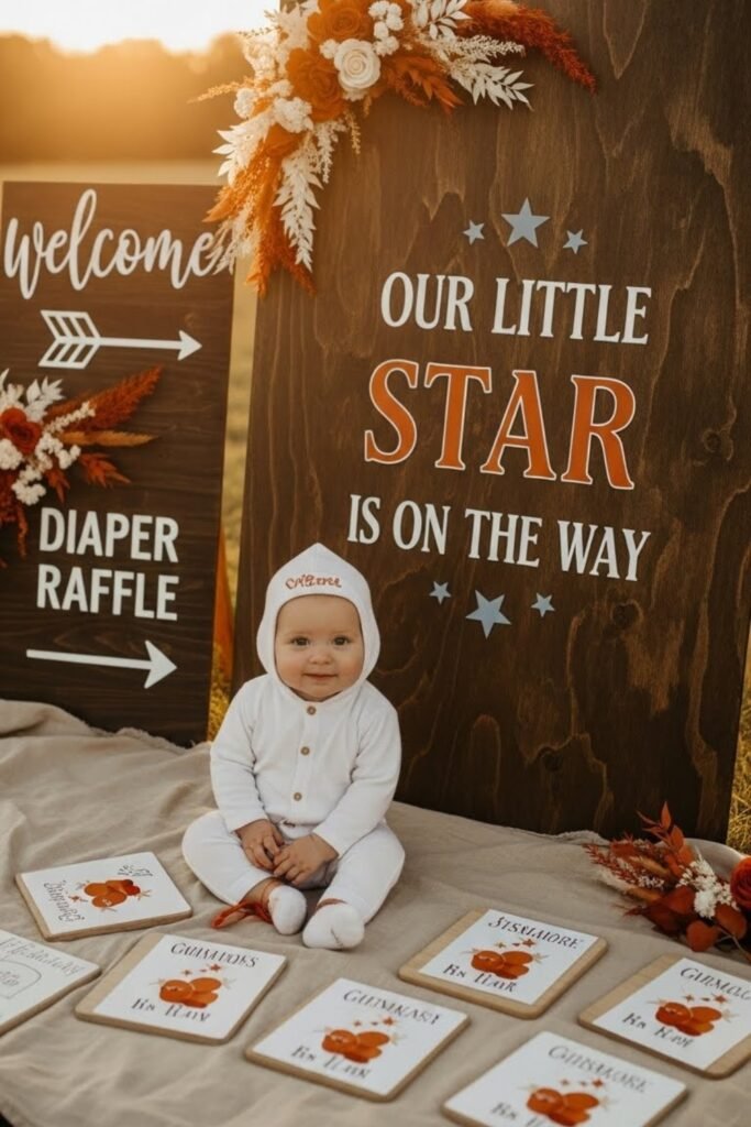 Place it near seating or the gift area to add a sentimental touch that balances rustic décor with baby shower warmth.