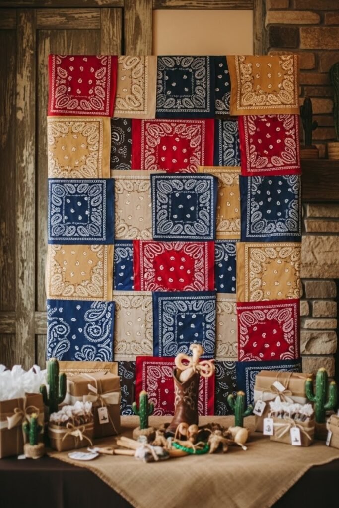 Design a backdrop using western bandanas arranged neatly on a wall or frame. Choose prints that stay within one color range to keep it visually calm.