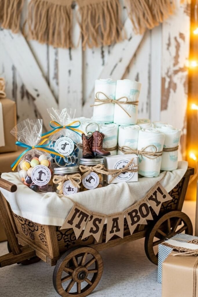Use a small wooden wagon to hold baby shower favors, diapers, or wrapped gifts. Line the wagon with soft fabric to keep it baby-friendly while maintaining a western feel.