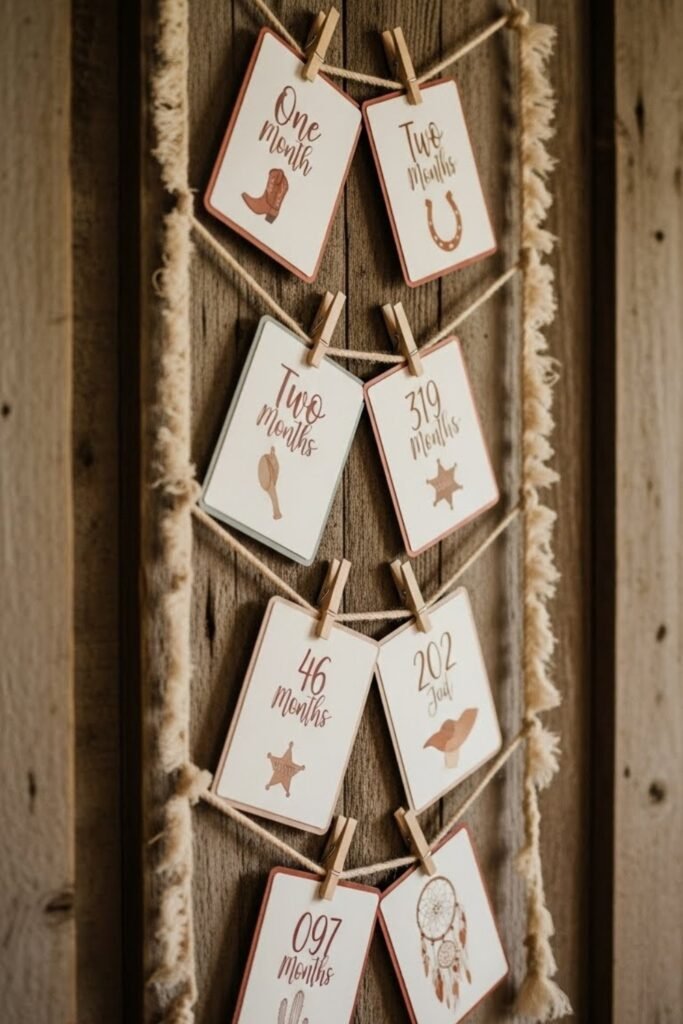 Create a western-style baby timeline using rope, mini clips, and small cards. Each card shows a baby milestone with subtle western icons like boots or stars.