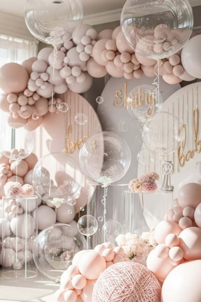 Decorate with bubble-inspired elements like clear balloons, round backdrops, and floating orbs. Keep colors soft—pearls, blush, and pale blues work beautifully.