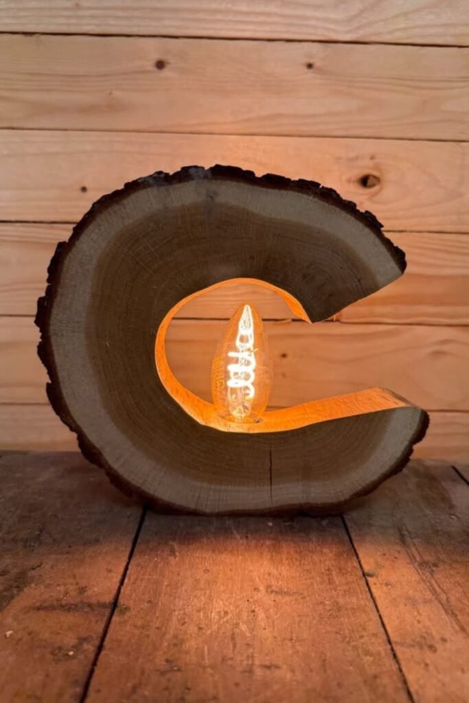 One smart trick for cozy ambience is carving a smooth inner curve from a thick log slice to cradle a warm filament bulb.