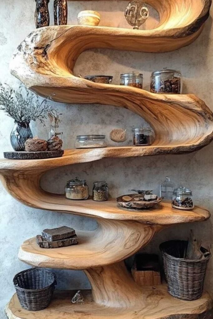 For a dramatic focal point, carving sweeping curves from a large timber slab produces a cascading shelf that looks naturally grown inside your room.