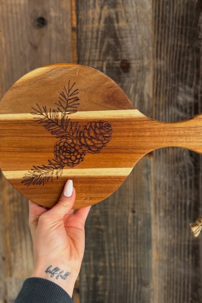 A simple way to personalize kitchen decor is burning botanical artwork onto a round wooden board, turning everyday serveware into meaningful handcrafted pieces.