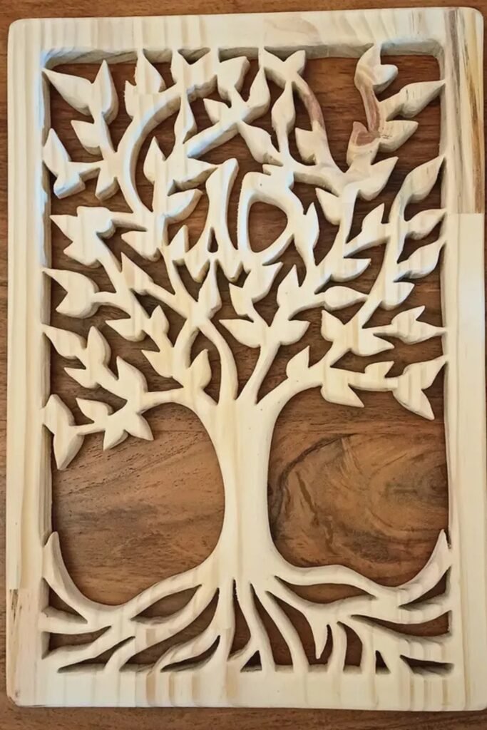 One way to add warmth instantly is using a carved wooden tree panel that brings organic texture wherever blank walls feel dull.