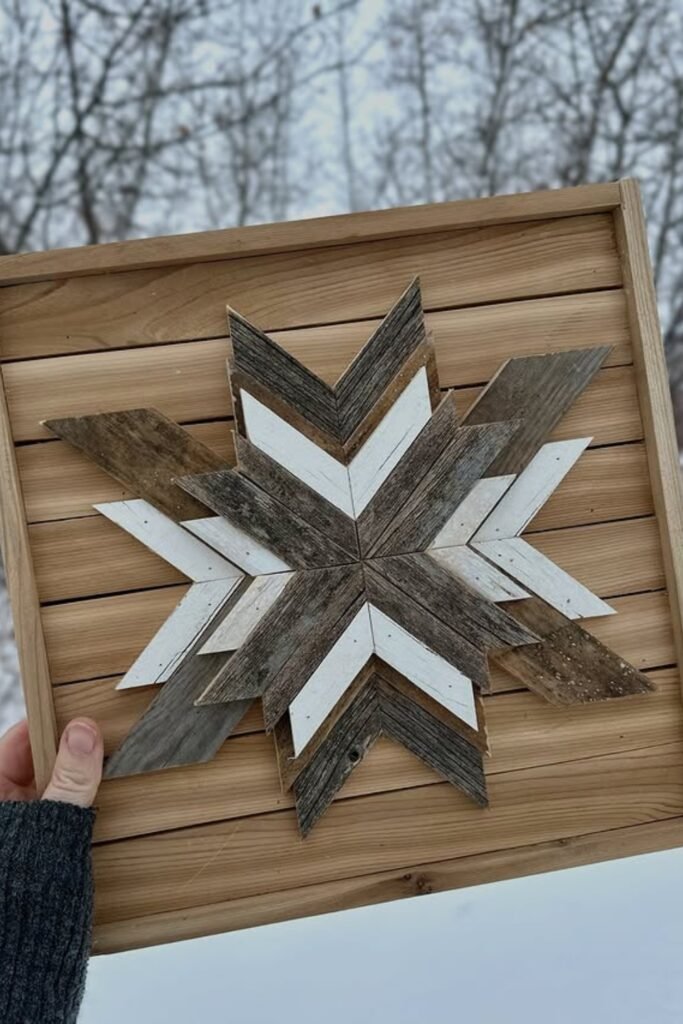 Use this artwork in foyers or winter-themed displays where its geometric shape and textured wood tones bring warm seasonal personality to the space.